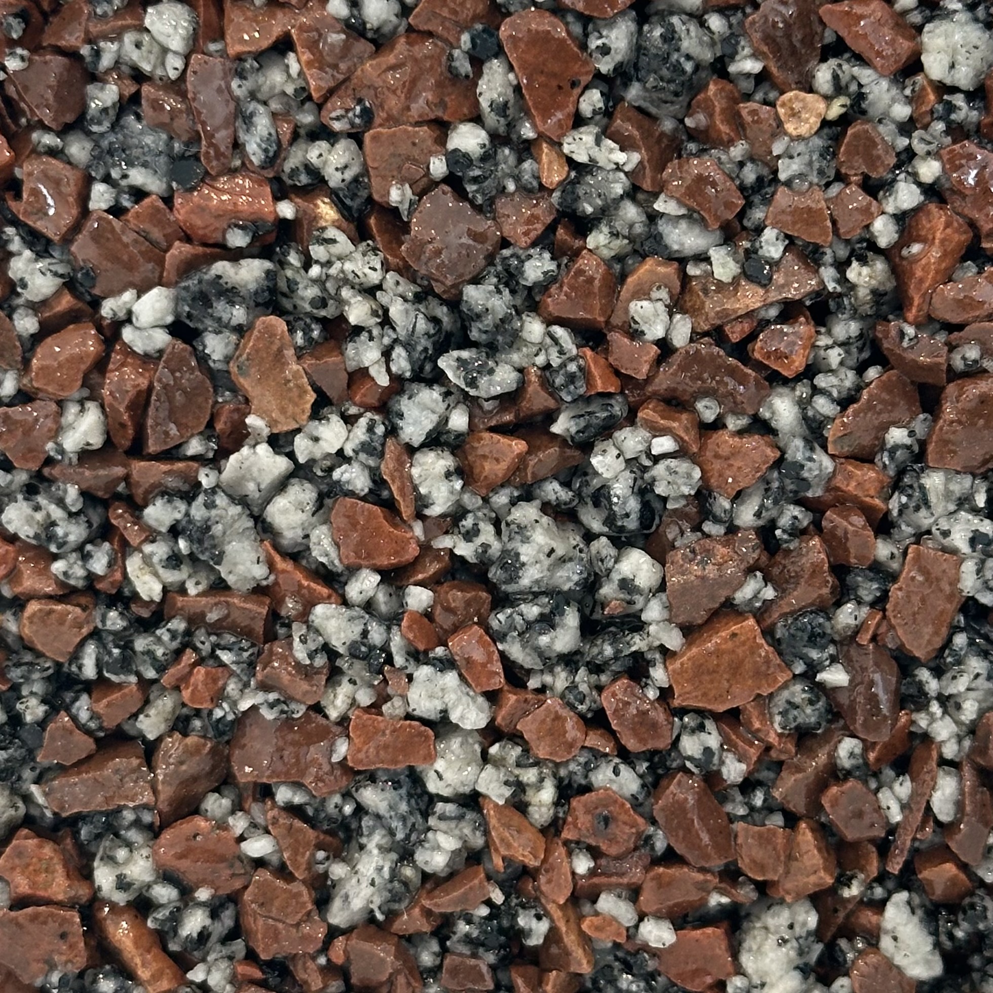 Feock is a unique and eye-catching blend that combines rich red-brown tones with contrasting Dalmatian aggregate. This distinctive mix creates a striking speckled effect, offering depth, texture, and visual interest. The warmth of the red-brown stones is beautifully offset by the crisp black and white flecks of the Dalmatian elements, resulting in a finish that is both bold and refined.